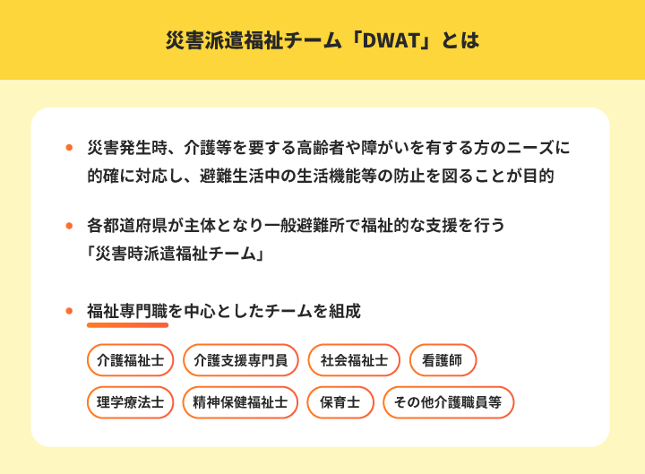 実は介護福祉士が活躍しているフィールドは、高齢者分野のみではなく、幅広い分野で活躍しています。皆さんは「DWAT」をご存じですか。