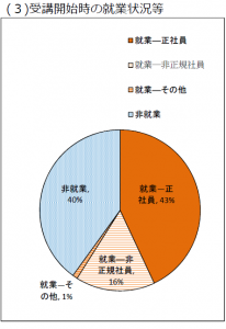 受講開始時の就業状況等は、就業―正社員が43%、就業―非正規社員が16%、就業―その他が1%、非就業が40%という結果でした。