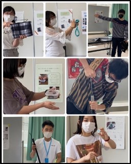授業の最後には、授業の集大成として「福祉用具コンテスト」を開催しました。今年はコロナの影響で、毎年関西で開催される大規模な福祉機器の展示会である“バリアフリー2020”が残念ながら中止となってしまい実際の福祉用具に触れる機会は減少してしまいましたが、自粛期間中に学生たちがアイデアと工夫を凝らし、身近な材料を使って一人ひとりがオリジナルの【自助具】を製作しました。もちろん製品のネーミングも商品価値が高まるような工夫がされています!