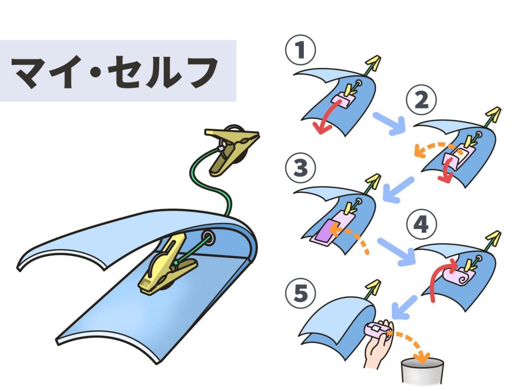 マイ・セルフは,生理用品を片手で付け替えられるように考案した福祉用具です。 汚れても綺麗に取り扱えるように特に使用する材料について検討しました。蓋の部分は柄付きの折り紙を差し込む事でデザインに幅をもたせました。太腿に当たる部分にはスポンジを使用することで,当たりを柔らかくし,アーチ状に型取ることで太腿からズレ落ちにくく工夫しました。紐の長さは長すぎると生理用品を引っ張るとき,かなり体の後方まで引かないといけなくなるので短めに設定しました。