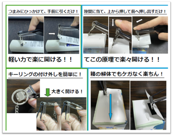 今回製作した「かけるくん」は隙間に当てて引くような簡単な動作しか必要とせず、また巧緻動作が可能であれば片手で行うことも出来ます。爪や指への負担を軽減しつつ、より簡単にできるようになる点が魅力です。