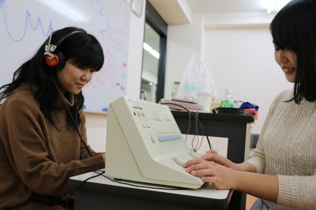 言語聴覚士科は、聴力検査を実施しました!在校生のスタッフによる検査を受けているところです。