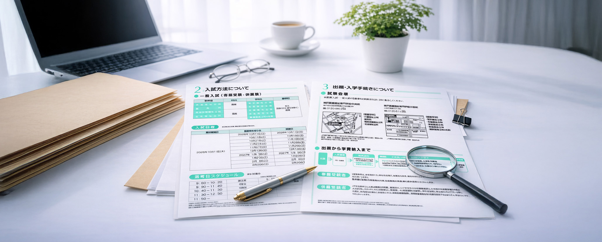 市販の封筒を使用し、「志望学科名/出願書類在中」と朱書きして、簡易書留で入試事務局宛に郵送してください。